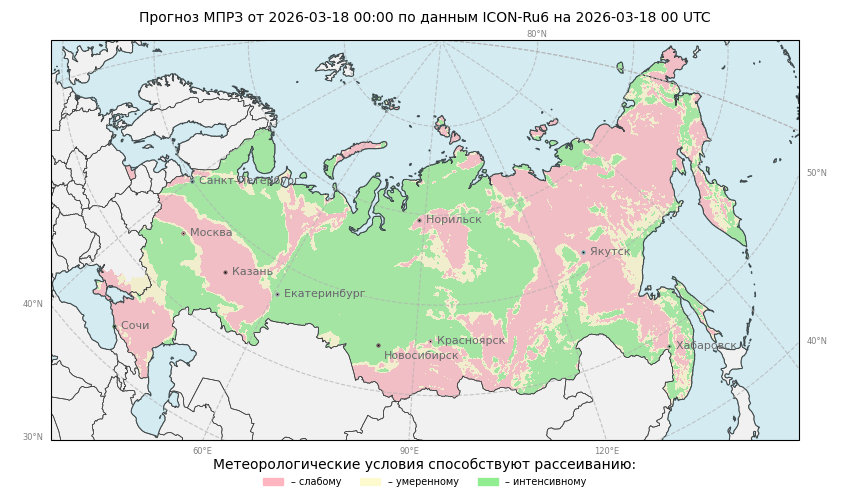 МПРЗ - метеорологический показатель рассеивания и загрязнения приземного воздуха. Метод расчета МПРЗ (разработан в ФГБУ «Гидрометцентр России», авт. д.г.н. Кузнецова И.Н., к.н. Ткачева Ю.В.) основан на учете скорости переноса в пограничном слое атмосферы, типа термической устойчивости и осадков. (Описание метода и алгоритма расчета). Для прогноза МПРЗ используются прогностические величины метеорологических параметров оперативной мезомасштабной модели атмосферы COSMO-RU с горизонтальным разрешением около 7 км.