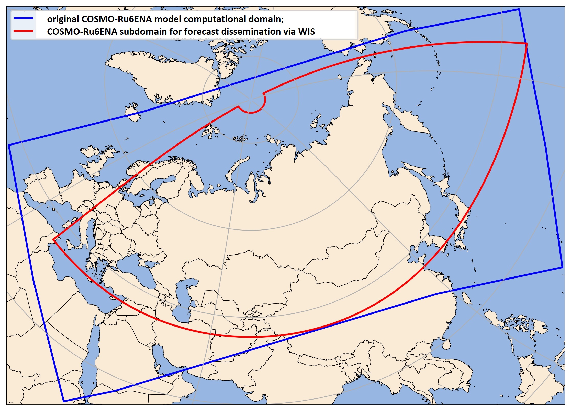 Fig.2. Computational domain of COSMO-Ru6ENA (blue contour) and its subdomain for forecast dissemination via the WMO Information System (red contour: 35°N-87°N, 19.5°E-193.5°E).