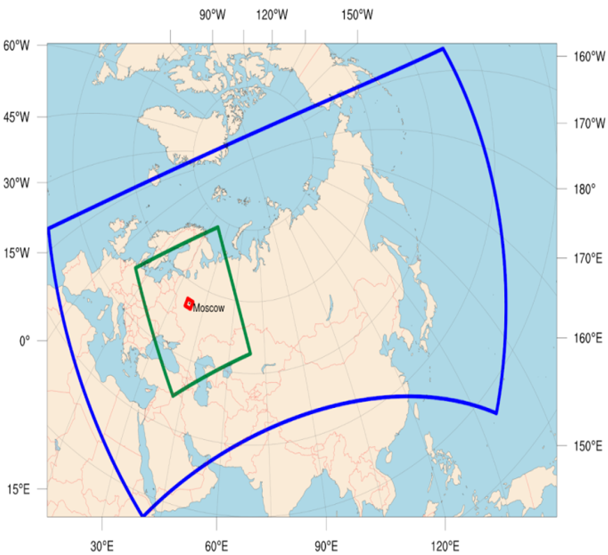 - Domain: Computational domain 29.5⁰-90⁰N, 180⁰W-180⁰E with grid spacing 6.5 km is nested into global domain with grid step 13km. Domain for forecast dissemination via WMO Information System 2.0 - to be identical to the COSMO-Ru6ENA subdomain (Fig.2, red contour)