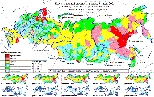 Высокая, местами чрезвычайная пожарная опасность 4-6 июля в Мурманской, Астраханской областях, Краснодарском крае, Калмыкии, в центральных районах Приволжского федерального округа, в Ханты-Мансийском а.о., Якутии, Хабаровском и Камчатском краях, Амурской и Магаданской областях.