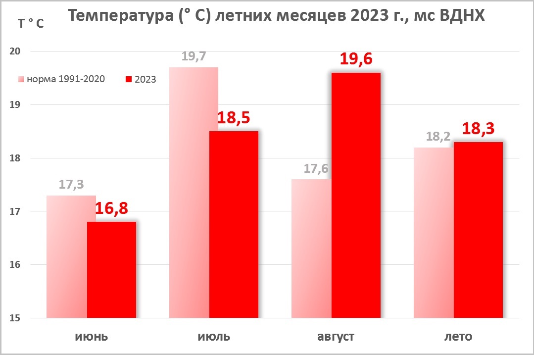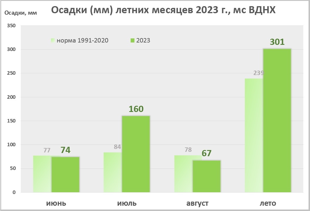 Июль по-настоящему прохладнее нормы, его аномалия более 1 градуса. Он принес почти 2 нормы осадков и стал седьмым за историю наблюдений с 1891 г. Больше всего дождей в столице приходится на июль 1965 г. – 186 мм.