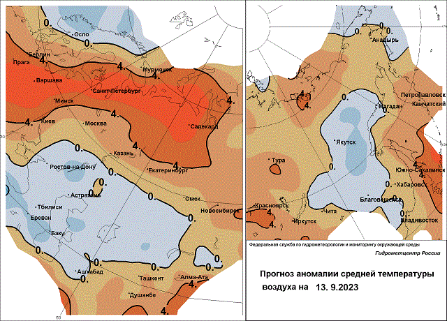 Небольшой малоподвижный циклон у восточного побережья Чукотки обусловит облачную погоду с небольшими осадками, вероятны туманы, ветер на побережье Чукотского моря усилится до 18 м/с. Температура воздуха 13-14 сентября 0…+5 градусов, ночью местами 0…-5 градусов, днем в континентальных районах местами +7…+12 градусов.