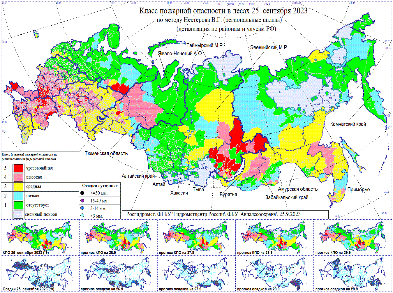 Высокая, местами чрезвычайная пожарная опасность 26-28 сентября на юге Коми, большей части Центрального, Приволжского федеральных округов, в Южном федеральном округе, Ставропольском крае, Свердловской, Тюменской областях, Ханты-Мансийском а.о., в Иркутской области, на востоке Бурятии, юге Хабаровского и Приморского краев.
