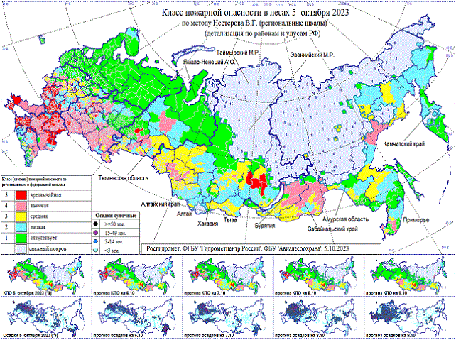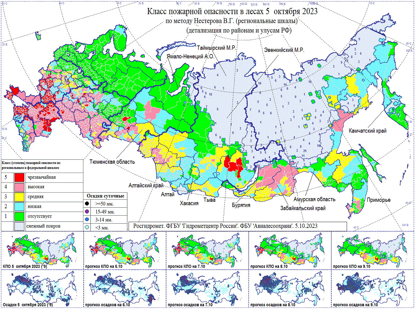 Высокая, местами чрезвычайная пожарная опасность 6-8 октября в южной половине Приволжского, на большей части Южного федеральных округов, в Ставропольском крае, на севере Дагестана, в Новосибирской области, на западе Иркутской области, севере Бурятии, Забайкальского и Хабаровского краев, на юге Приморского края, 6-7 октября в южной половине Центрального и Уральского федеральных округов, 7-8 октября в Томской области.