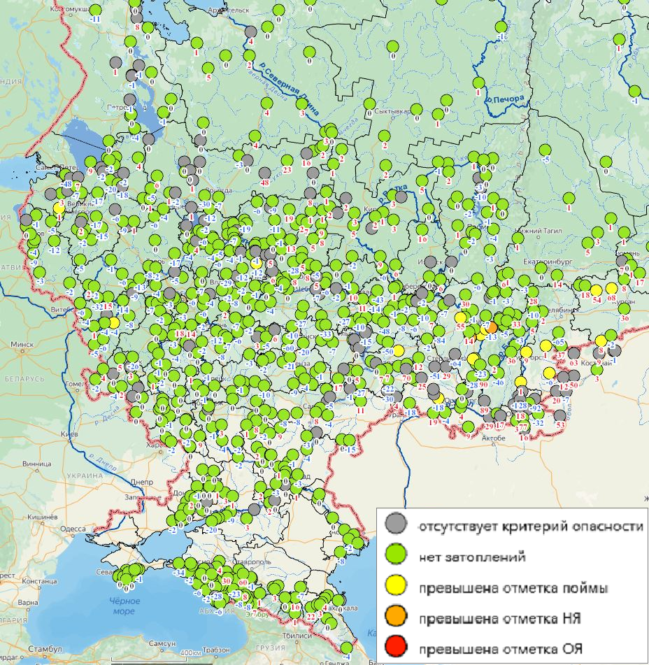 Развитие процессов весеннего половодья наблюдается на реках центра и юго-востока европейской части России, а также на юге Сибирского федерального округа. Наиболее интенсивный рост уровня воды до 2,5 -4,5 м (р. Орь у с. Ащебутак) за последние сутки, связанный с поступлением талых вод в речную сеть, а также с формированием кратковременных заторов льда, происходит на реках Самарской, Оренбургской, Челябинской, Курганской областей, а также Республики Башкортостан и Красноярского края, с выходами воды на поймы рек и превышением отметок неблагоприятного и опасного явлений (см. таблицу).