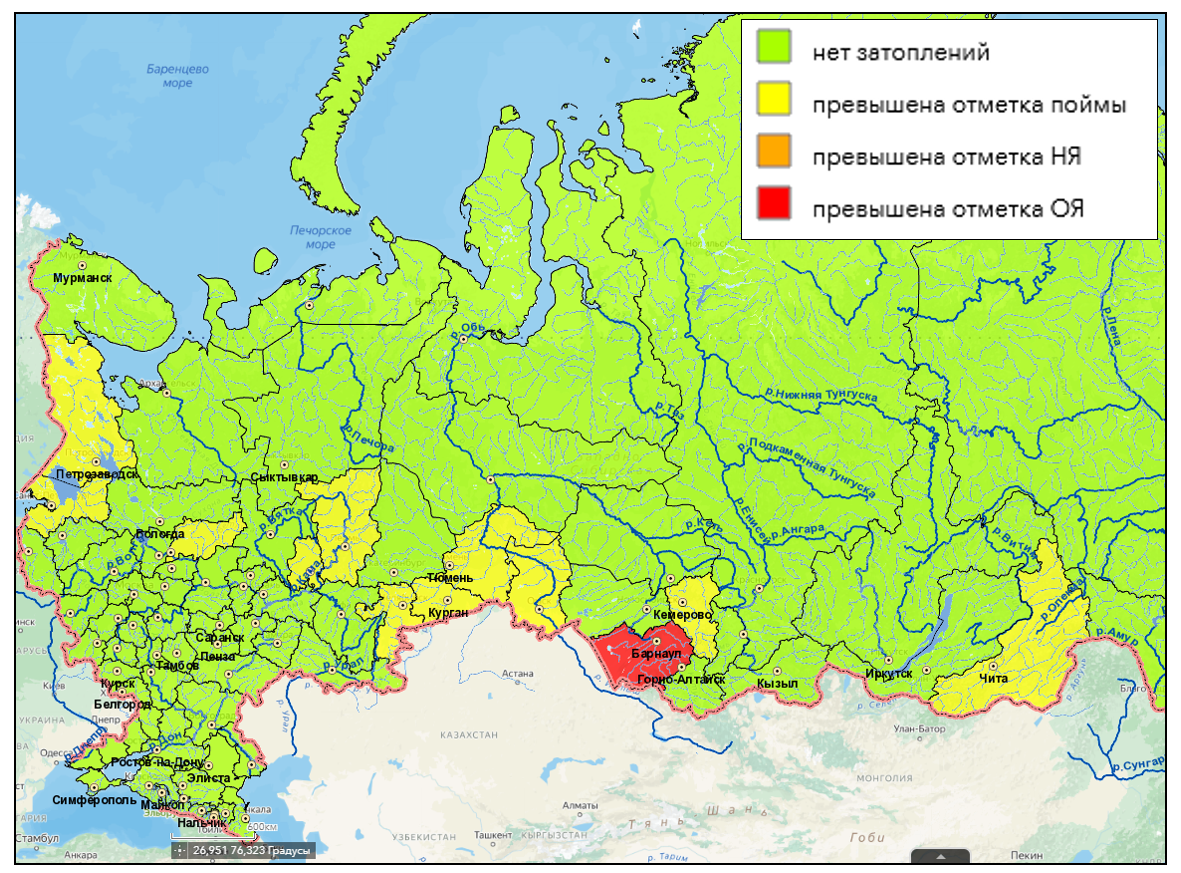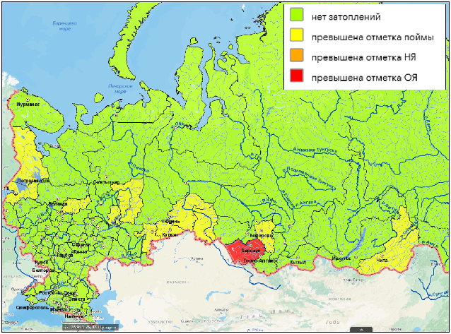 Развитие процессов весеннего половодья наблюдается на реках запада Северо-Западного, севера Центрального, Приволжского, юга Уральского, юго-запада Сибирского федеральных округов. Наиболее интенсивный рост уровня воды до 0,8-1,5 м за сутки (р. Вага у г. Шенкурск), связанный с поступлением талых вод в речную сеть, наблюдается в Архангельской области, Пермском крае, Алтайском крае, Челябинской, Тюменской, Омской, Кемеровской, Новосибирской, Томской областях. На реках местами затоплена пойма, на р. Чапша у с. Красногорское (Алтайский край) превышена опасная отметка.
