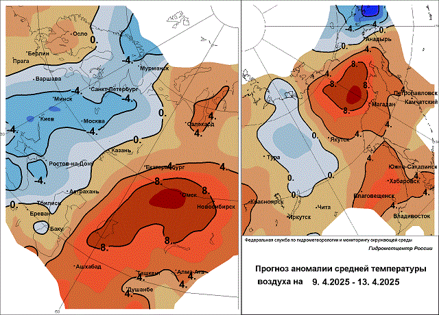 8 апреля активный циклон принесёт сильные осадки в виде снега, мокрого снега и дождя на восток и юго-восток Якутии; 9-10 апреля - на юг республики. Термометры 10-11 апреля днём покажут 0…+5 градусов, при осадках 0…-5 градусов, на востоке +4…+9 градусов, на северо-западе до -12, на побережье -15…-20 градусов.