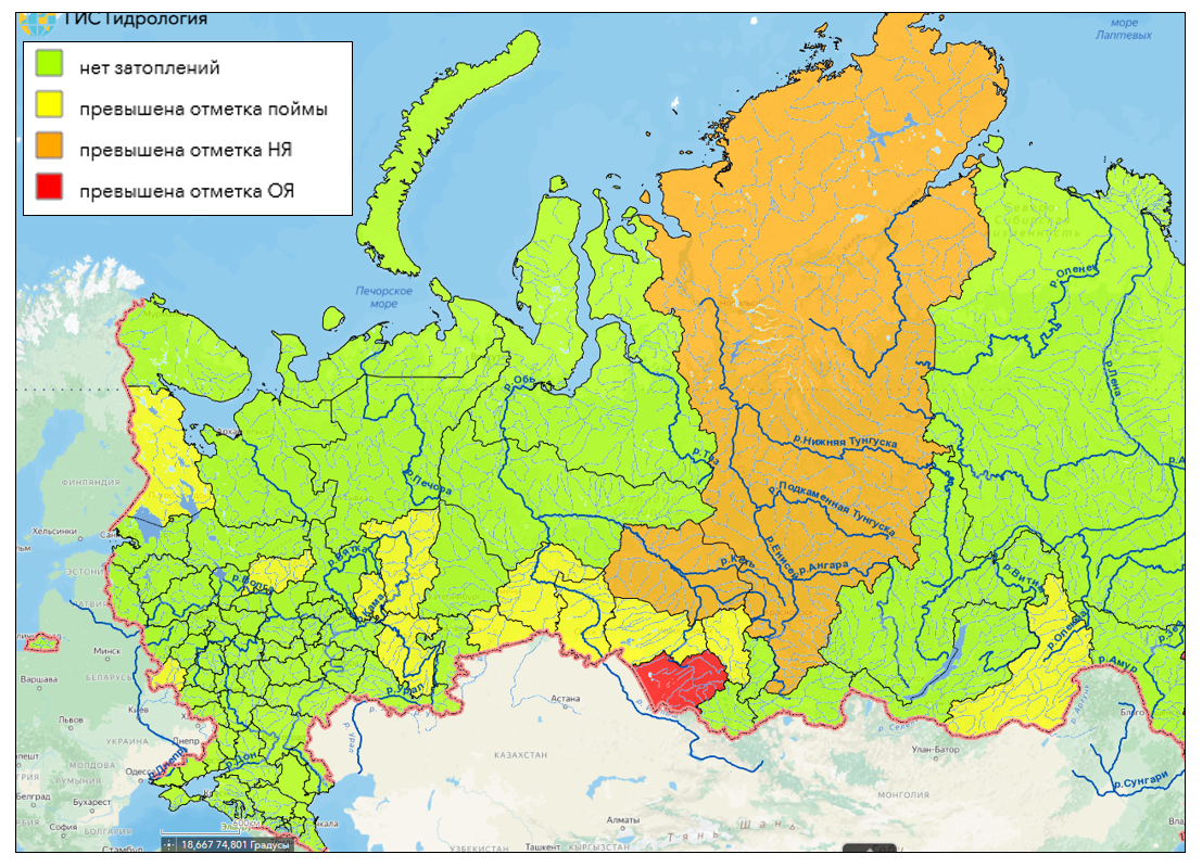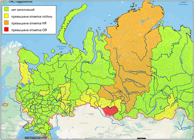 Развитие процессов весеннего половодья наблюдается на реках запада Приволжского, юга Уральского, юга Сибирского, юга Дальневосточного федеральных округов. Наиболее интенсивный рост уровня воды до 0,8-1,9 м за сутки (р. Обь у с. Никольское), связанный с поступлением талых вод в речную сеть, наблюдается в Омской, Кемеровской, Томской, Иркутской областях и Приморском крае. На реках местами затоплена пойма, на р. Чулым у с. Новобирилюссы (Красноярский край), р. Чумыш у с. Ельцовка (Алтайский край) превышена опасная отметка.