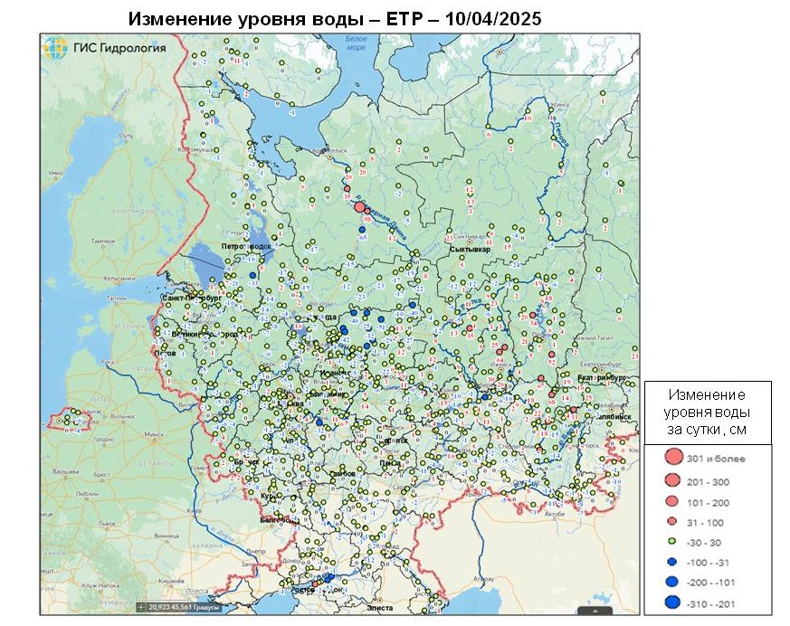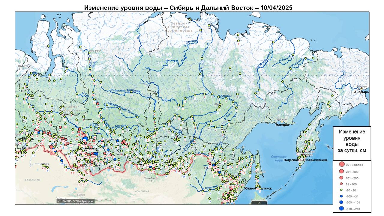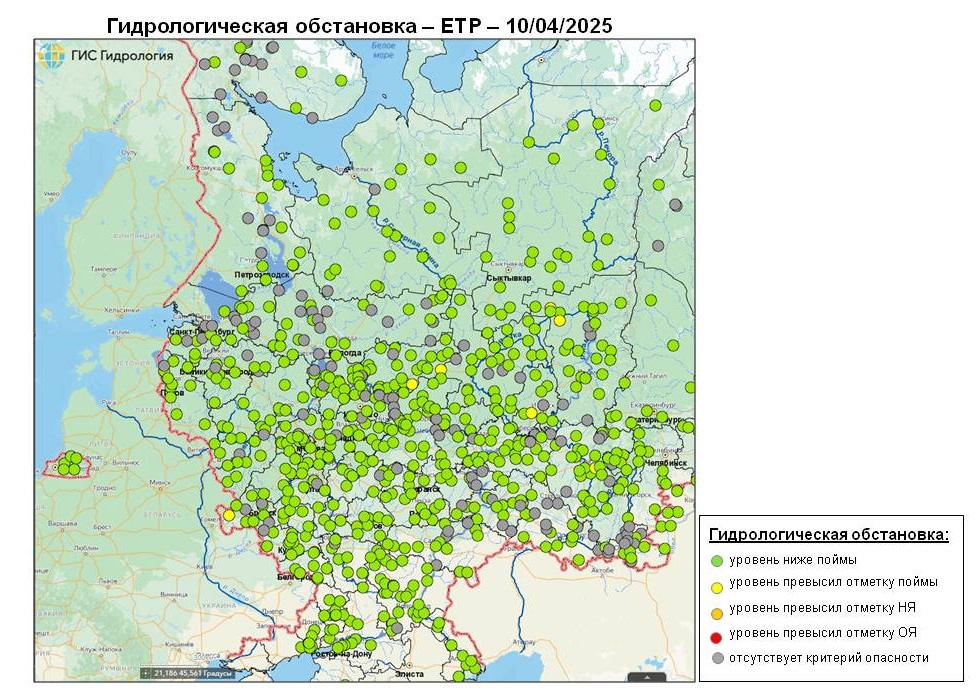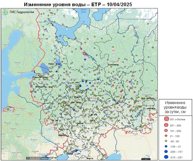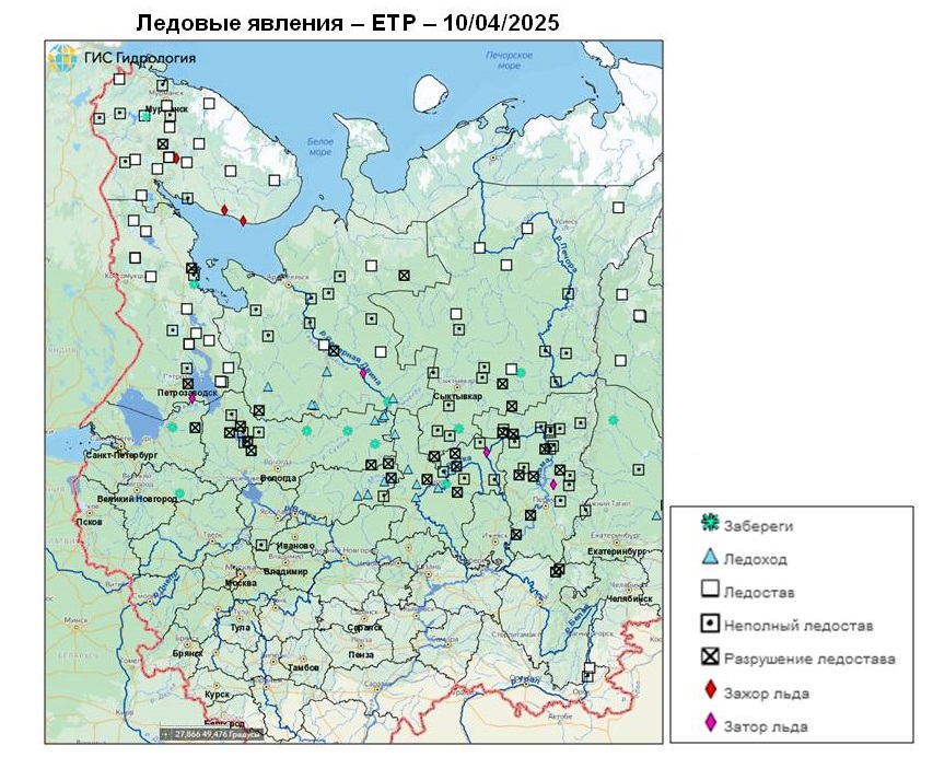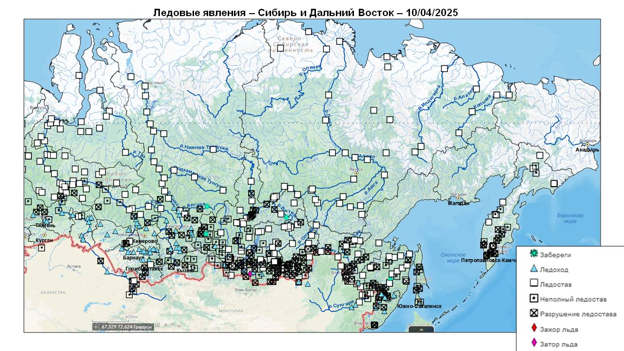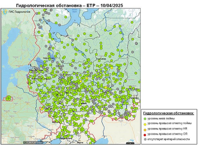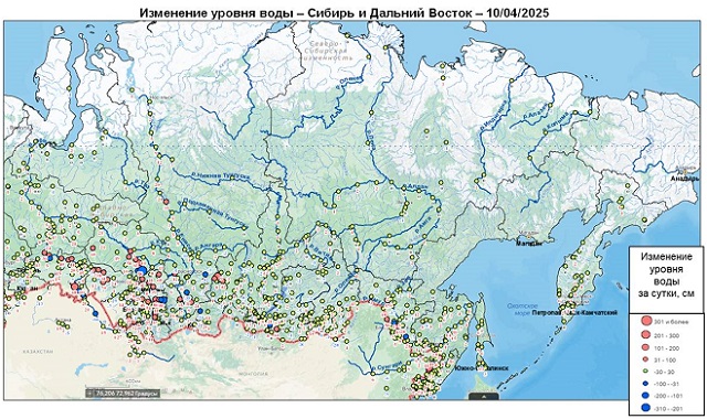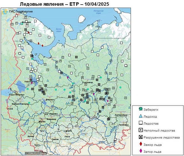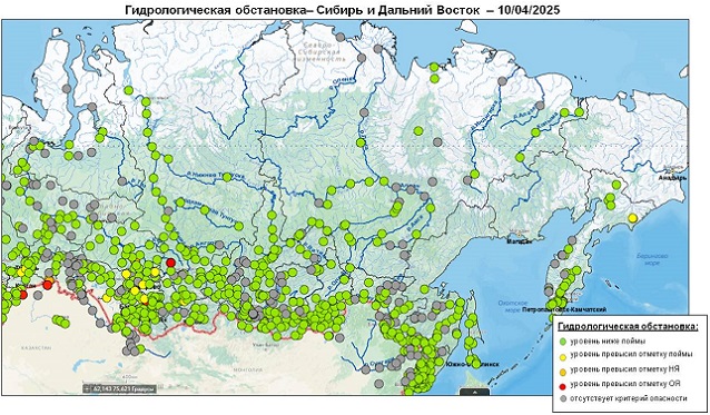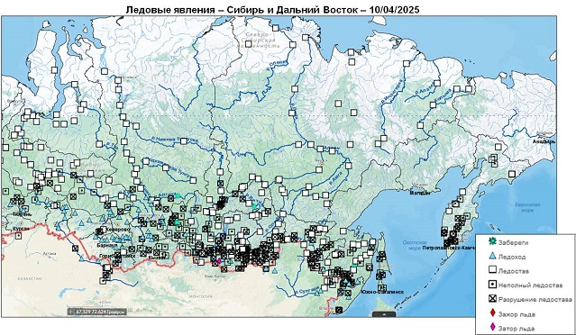 Уровень воды превышает отметку поймы местами на реках Карелии, Башкортостана, Удмуртии, Пермского края, Костромской, Брянской, Новосибирской, Кемеровской, Омской, Тюменской, Курганской областей, Алтайского, Красноярского, Забайкальского краёв.