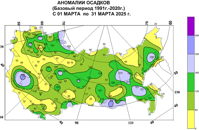 Аномалии осадков (%) в России в марте 2025 г.