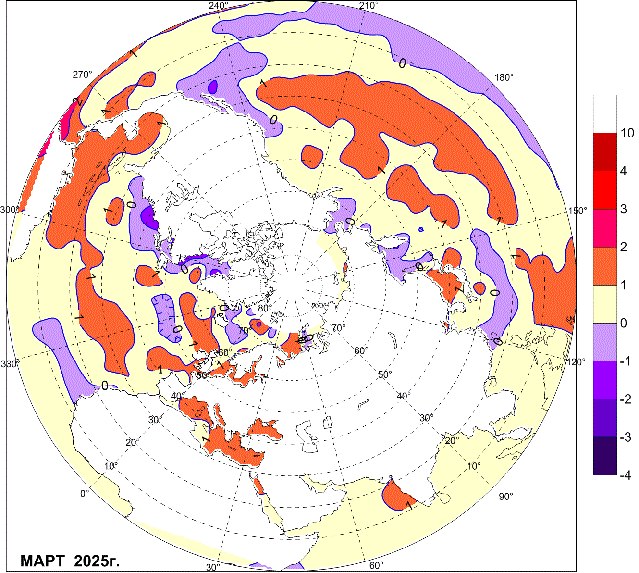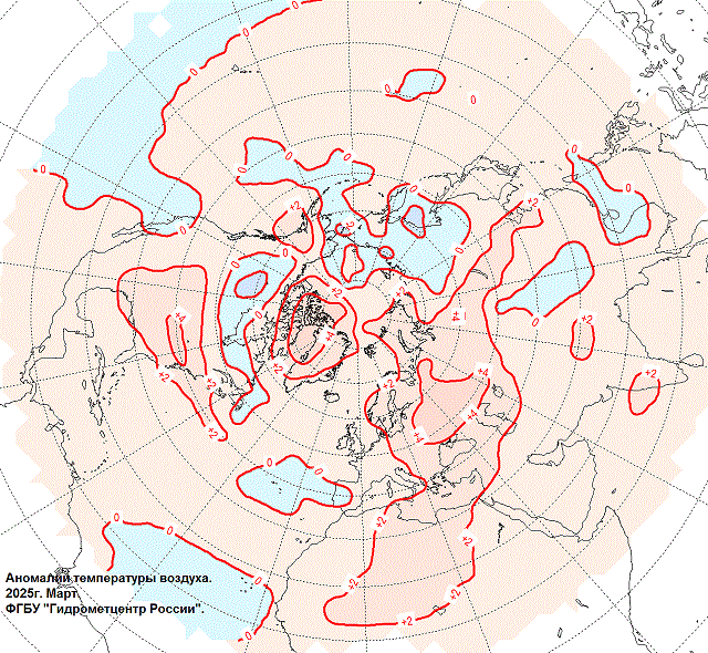 Аномалии температуры воздуха на Северном полушарии в марте 2025 г.