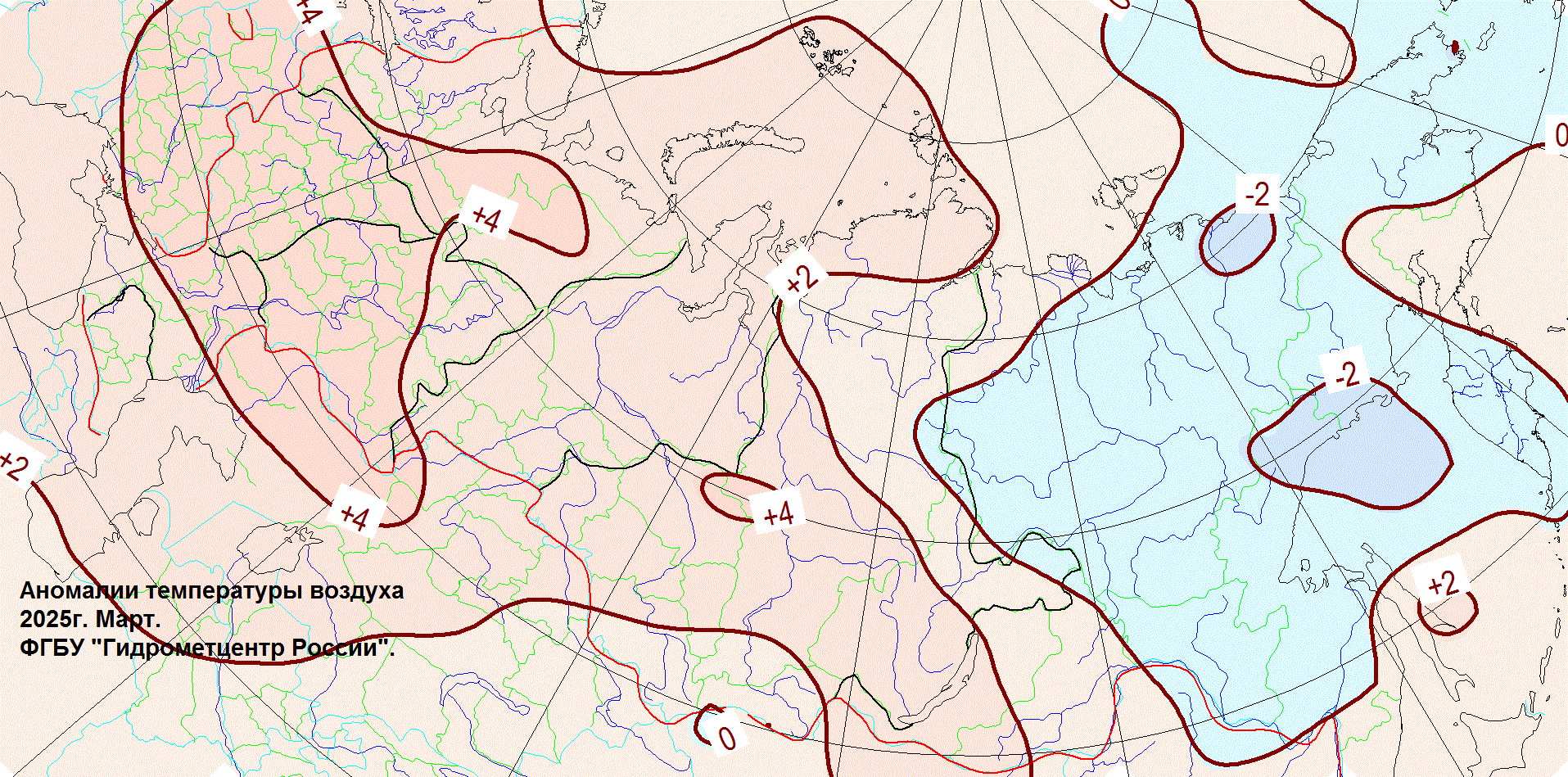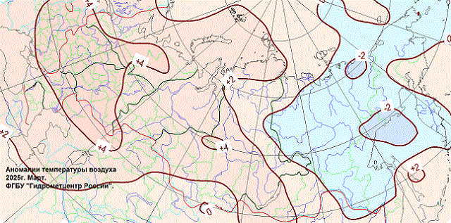 Аномалии температуры воздуха в России в марте 2025 г.