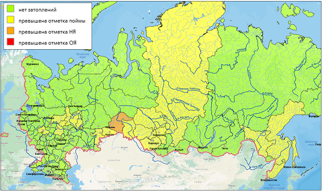 Развитие процессов весеннего половодья наблюдается на реках запада Центрального, Уральского, юга Сибирского, юга и юго-востока Дальневосточного федеральных округов. Наиболее интенсивный рост уровня воды до 1,3-1,4 м за сутки наблюдается Хабаровском крае (Амур у н.п. Казакевичево) и Забайкальском крае (Ингода н.п. Тарская), также подъемы воды отмечаются в Смоленской, Тюменской, Кемеровской, Омской, Иркутской области, Приморском и Красноярском крае. На реках местами затоплена пойма, а на р. Ишим у с. Ильинка (Тюменская область) уровень воды достиг неблагоприятной отметки.