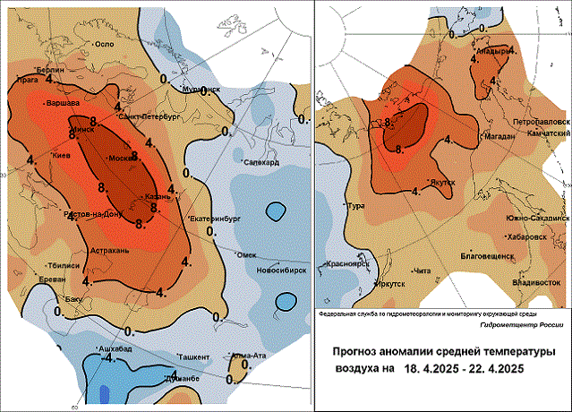 18-20 апреля. На севере Приволжского федерального округа аномально жаркая погода. В Томской области осадки в виде мокрого снега, снега и дождя, 18 апреля гололедные явления, 20 апреля ветер до 22 м/с. В Кемеровской области осадки в виде дождя, переходящего в мокрый снег и снег, ветер 17-22 м/с, 18 апреля гололедные явления. В Республике Алтай ветер до 25 м/с и более, 18-19 апреля в горах до 35 м/с и более, 18 апреля осадки в виде дождя и мокрого снега, метель, гололедные явления. В центральных и южных районах Краснодарского края и в Хакасии дождь, мокрый снег, ветер до 25 м/с и более.