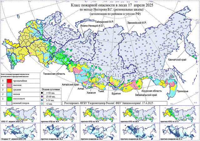 Высокая, местами чрезвычайная пожарная опасность 18 апреля на западе Тывы, 18-20 апреля на западе Воронежской, юге Астраханской и Саратовской областей, на западе Новосибирской и Иркутской областей, на юге Бурятии и Хабаровского края, в Забайкальском крае.