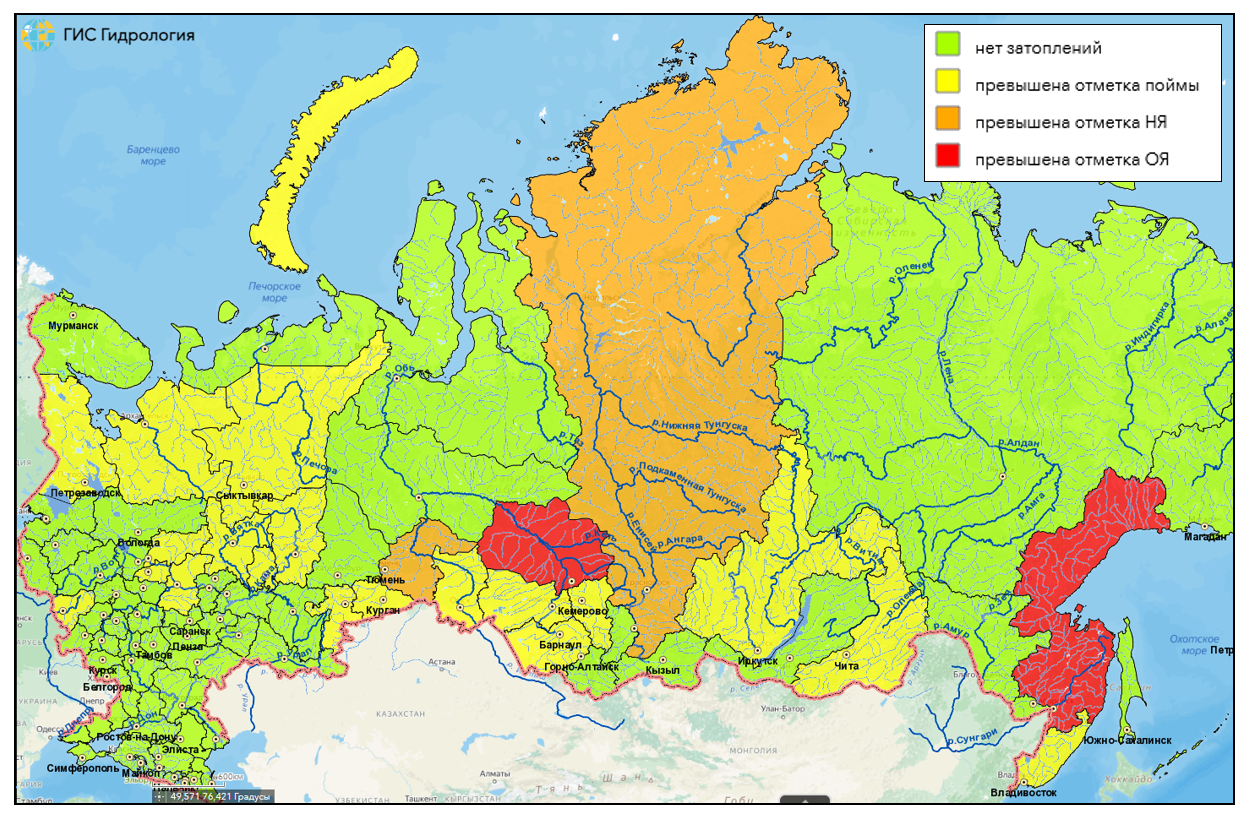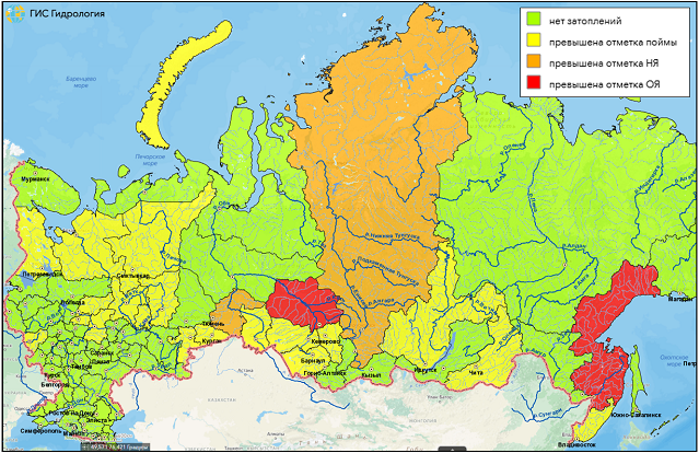 Развитие процессов весеннего половодья наблюдается на реках Центрального, Уральского, Приволжского, юга Сибирского, юга и юго-востока Дальневосточного федеральных округов. Наиболее интенсивный рост уровня воды до 0,5-1,2 м за сутки отмечаются в Вологодской, Архангельской, Кировской, Тюменской, Томской, Иркутской, Амурской областях, Коми, Пермском, Хабаровском краях, Ханты-Мансийском а.о., Еврейской автономной области. Повышение уровня воды на 1,9 м за сутки отмечается на р. Амур у с. Нагибово в Еврейской автономной области. На реках местами затоплена пойма, на р. Ишим у с. Ильинка (Тюменская область), а также на р. Чая у с. Подгорное, р. Чулым у с. Тегульдет и р. Бакчар у с. Гореловка (Томская область) сохраняется превышение неблагоприятной отметки, на р. Парбиг у с. Парбиг (Томская область) и р. Тумнин у п. Тумнин (Хабаровский край) превышена опасная отметка.