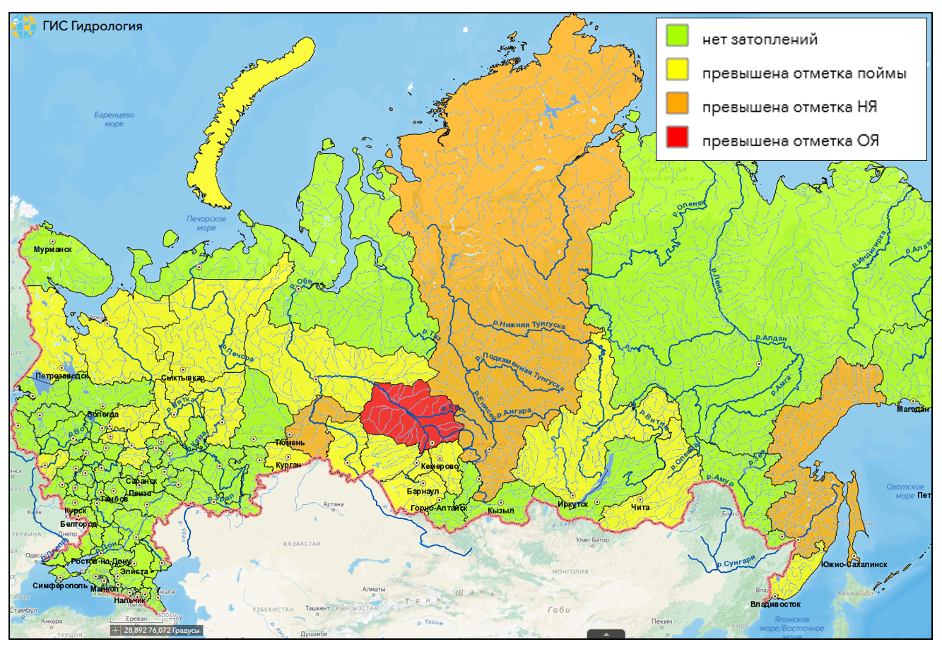 Развитие процессов весеннего половодья наблюдается на реках Северо-Западного, Приволжского, Уральского, Сибирского, юга и юго-востока Дальневосточного федеральных округов. Наиболее интенсивный рост уровня воды до 0,8-1,7 м за сутки отмечается в Архангельской, Иркутской, Амурской областях, Пермском, Красноярском, Хабаровском краях, Хакасии. Повышение уровня воды на 2,1-3,0 м за сутки отмечается на р. Томь на участке г. Новокузнецк – г. Кемерово, р. Мрас-Су у г. Мыски и п. Усть-Кабырза, р. Кондома у п. Кузедеево (Кемеровская область), р. Тогул у с. Тогул в Алтайском крае. На р. Мрас-Су у п. Усть-Кабырза (Кемеровская область) уровень воды кратковременно достигал опасную отметку. На реках местами затоплена пойма, на р. Ишим у с. Ильинка (Тюменская область), а также на р. Чая у с. Подгорное, р. Чулым у с. Тегульдет и р. Бакчар у с. Гореловка (Томская область), р. Кеть у с. Лосиноборское сохраняется превышение неблагоприятной отметки, на р. Парбиг у с. Парбиг (Томская область) превышена опасная отметка. За прошедшие сутки уровень воды достиг неблагоприятной отметки на р. Тумнин у п. Тумнин (Хабаровский край) и р. Тымь у с. Ныш (Сахалинская область).