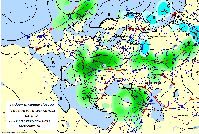 Вчера 23 апреля в Кабардино-Балкарии прошёл сильный ливень с грозой: на ГП Котляревская в период 19.30 – 20.00 выпало до 49,5 мм осадков. Вечером 23 апреля и ночью 24 апреля наблюдался очень сильный дождь и комплекс метеорологических явлений: на МП Александровская в период 21.00-01.30 зафиксировано 73,5 мм влаги. Сильный ливневый дождь, гроза и крупный град отмечался 23 апреля в Северной Осетии, за час выпало 30 мм осадков. 23 - ночью 24 апреля - в Ставропольском крае выпало до 18 мм влаги.
