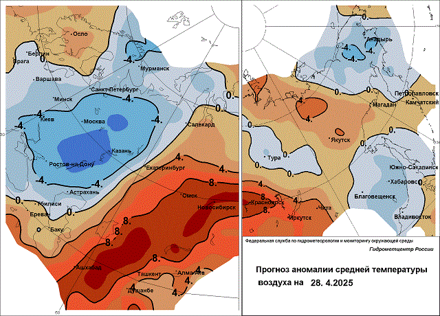 26-28 апреля на большей части Центрального округа пройдут небольшие и умеренные осадки в виде дождя и мокрого снега, сопровождаемые порывистым ветром до 15-17 м/с. Уже 24 апреля температура воздуха медленно начала понижаться, а к выходным дням похолодание достигнет своего пика: аномалия минимальной температуры воздуха 26-28 апреля составит -4…-7 градусов. В ночные часы температура воздуха в северных областях ЦФО понизится до 0…+5 градусов, местами ожидаются заморозки до -1…-5 градусов, в том числе и в столичном регионе. В южных областях и Черноземье предстоящей ночью заморозков не предвидится, а температура воздуха составит +2…+8 градусов, в Черноземье +4…+9, местами +7…+12 градусов. Но уже ночью 27 и 28 апреля подморозит до 0…-3 градусов. Наиболее холодным днём станет 27 апреля, когда воздух в дневные часы прогреется лишь до +4…+10 градусов в северной половине Центрального округа; термометры покажут +7…+12, местами +14 градусов - в южной половине. С начала следующей недели температура воздуха в дневные часы начнёт немного повышаться.