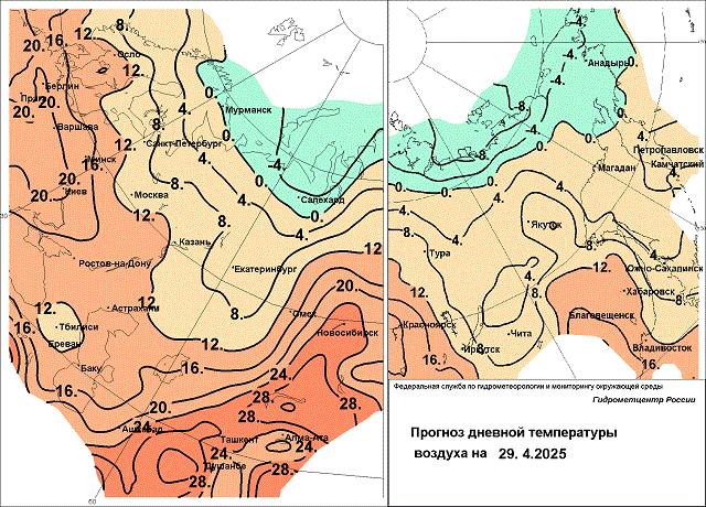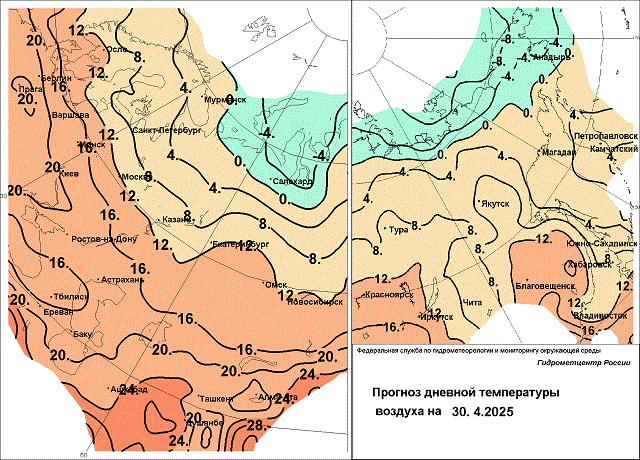 При прохождении циклона в его тыловой части возникнет значительное похолодание. Наиболее холодным днём на Урале, в Тюменской и Омской областях станет 29 апреля, когда максимальная температура воздуха составит лишь +2…+7 градусов, в Омской области +6...+11 градусов.