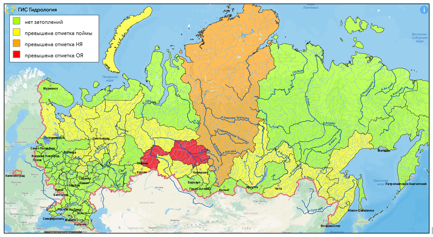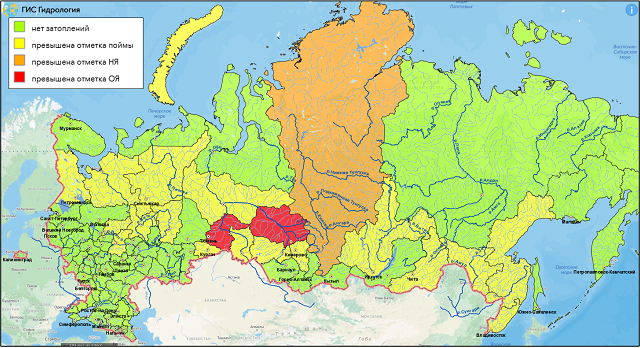 Развитие процессов весеннего половодья наблюдается на реках Приволжского, Уральского, Сибирского, юга и юго-востока Дальневосточного федеральных округов. Наиболее интенсивный рост уровня воды до 0,5-1,1 м за сутки отмечается в Волгоградской, Самарской, Ульяновской, Иркутской, Амурской, Кемеровской областях, Пермском, Алтайском, Красноярском краях, республиках Алтай и Саха (Якутия), Ханты-Мансийском автономном округе. Рост уровня воды на 1,3-1,7 м за сутки отмечается на р. Гилюй у Перевоза (Амурская область) и р. Мая у с. Усть-Юдома (Республика Саха(Якутия)).