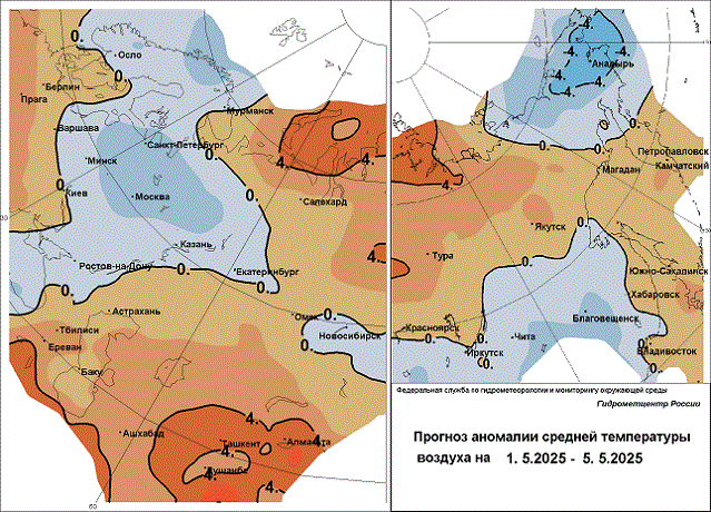1-3 мая. На севере Центрального федерального округа заморозки (температура ночью -6…-1°). На севере Приволжского федерального округа 1-3 мая заморозки (температура ночью до -2°), 2 мая сильные осадки (дождь, мокрый снег). На севере Оренбургской области заморозки (температура ночью -4…-2°). На юге Краснодарского края сильный дождь, гроза, град. В Свердловской области 1-3 мая заморозки (температура ночью до -6…-1°, 3 мая на западе сильный дождь. В Пермском крае 1 мая осадки (снег, мокрый снег, дождь), на севере установление временного снежного покрова 1-2 мая заморозки (температура ночью -7…-2°), 3 мая сильный дождь. В Приморском крае 1 мая на южном побережье ветер до 26 м/с, 2-3 мая сильный и очень сильный дождь, ветер на побережье 22-25 м/с.