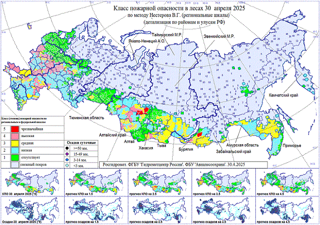 Высокая, местами чрезвычайная пожарная опасность 1 мая в Рязанской, Владимирской, Московской, Тамбовской, Липецкой, Тульской, Калужской, Нижегородской, Пензенской областях и Мордовии, 1 ¬– 3 мая в Смоленской, Брянской, Курской, Белгородской, Воронежской областях, Республике Крым, Херсонской, Запорожской, Ростовской, Волгоградской, Астраханской областях, Калмыкии, на юге Томской области и Бурятии, в Новосибирской области, на западе Алтайского края и Тывы.