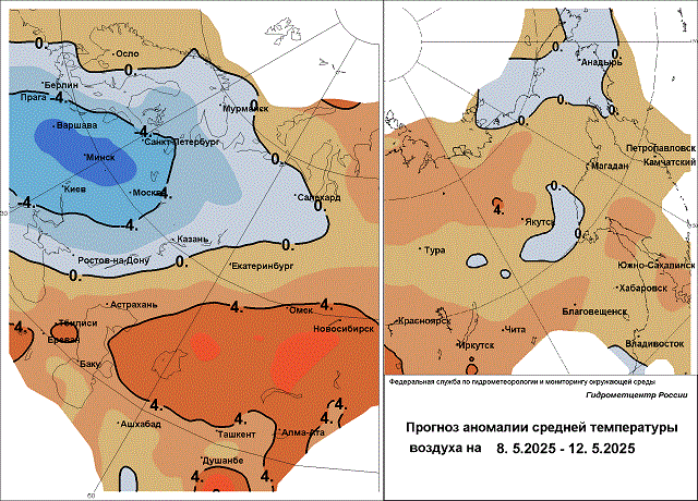8-10 мая. Заморозки в Калининградской области (температура ночью и утром до -5°), в Москве, в Московской, Калужской, Брянской, Ярославской (до -2°), Тверской, Ивановской областях, в Мордовии (до -3°). В Ставропольском крае сильный дождь, ливневый дождь, гроза, град, ветер до 25 м/с. В Ингушетии 8 мая в горах выше 2500 м лавиноопасно, 9 мая в отдельных районах сильный дождь, 10 мая в горных районах ветер до 25 м/с.
