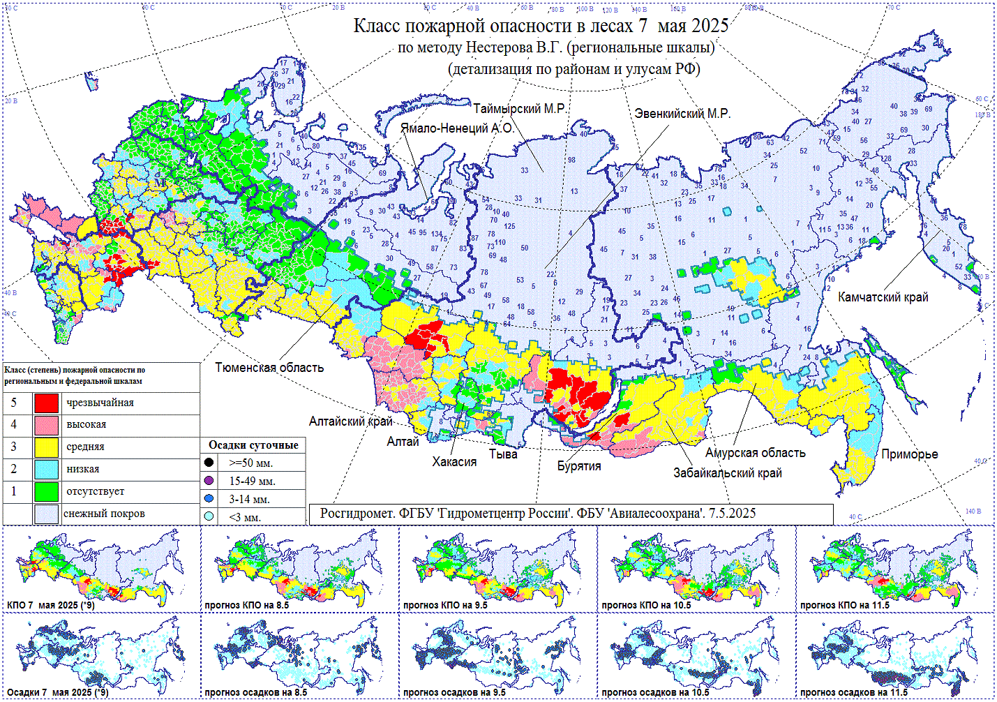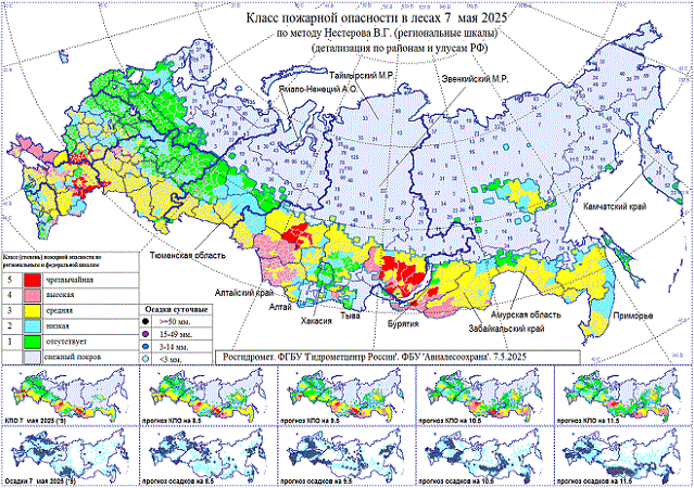 Высокая, местами чрезвычайная пожарная опасность 8-10 мая на востоке Южного федерального округа, в Донецкой Народной Республике, Запорожской и Херсонской областях, в Томской, Новосибирской областях, Алтайском крае, на западе Тывы, юге Иркутской области, Бурятии и Забайкальского края.