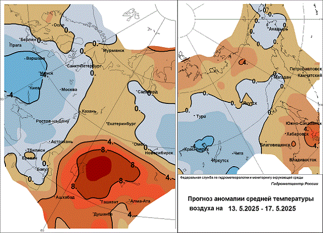 13 мая. Заморозки в Московской, Владимирской, Костромской, Ивановской, Калужской, Брянской, Тульской областях, на севере Приволжского федерального округа (температура ночью до -1°), в Смоленской, Тверской, Рязанской, Орловской, Кировской, Самарской, Свердловской областях (до -2°). В Ставропольском крае, Карачаево-Черкесии, Северной Осетии, Ингушетии и Чеченской Республике сильный дождь, гроза. В горных районах Кабардино-Балкарии выше 2000 м лавиноопасно. На востоке Чукотского автономного округа ветер до 25 м/с.