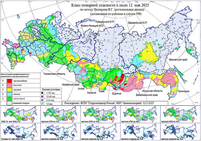 Высокая, местами чрезвычайная пожарная опасность 13-15 мая в Волгоградской области, Донецкой, Луганской Народных Республиках, Запорожской и Херсонской областях, на севере Дагестана, юге Саратовской области, в Томской области, Алтайском крае, на западе Тывы, юге Иркутской области, в Бурятии, Забайкальском крае, на юге Амурской области и Хабаровского края, в Приморском крае.