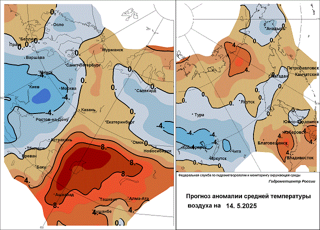 Аномалия максимальной температуры воздуха составит -2…-4 градуса. Воздух в Южном округе в дневные часы 14 мая прогреется до +13…+18, местами до +22 градусов, на черноморском побережье - до +15…+20 градусов. 15-16 мая потеплеет на 2-3 градуса.