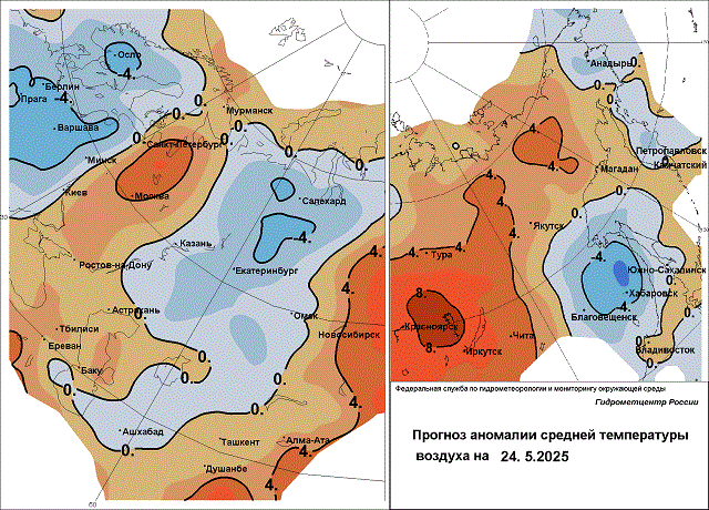 24 мая. Переменная облачность. Без осадков. Tемпература ночью 9...14°, днем 21...26°. Ветер южный 2-7 м/с.