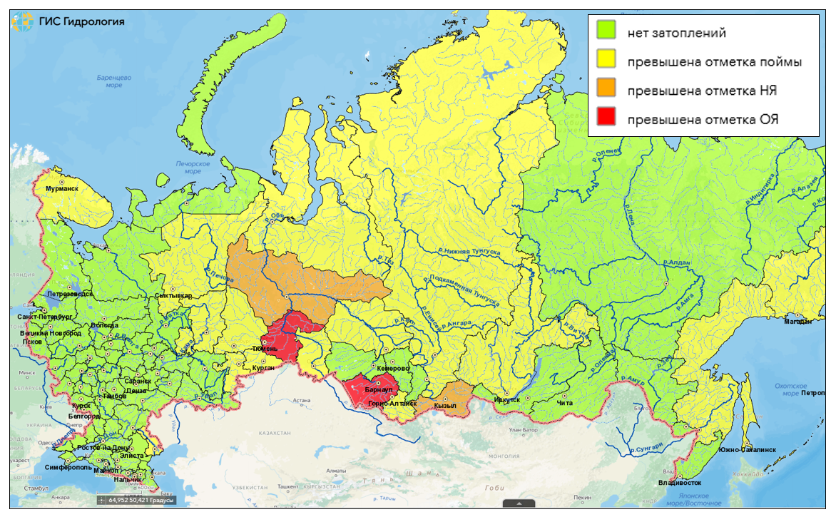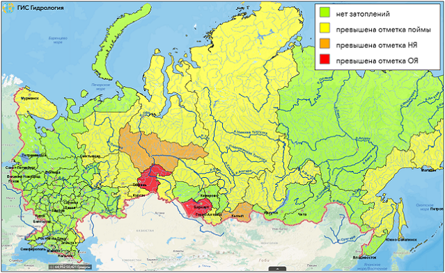 На р. Ишим у с. Ильинка (Тюменская область), р. Вандрас у п. Салым, Большой Салым у с. Лемпино и р. Большой Юган у с. Угут (ХМАО), р. Кеть (Большая Кеть) у с. Лосиноборское, (Красноярский край), р. Енисей у г. Кызыл (республика Тыва), р. Баимка у с. Баимка (Чукотский а.о.) наблюдается превышение неблагоприятной отметки уровня воды.