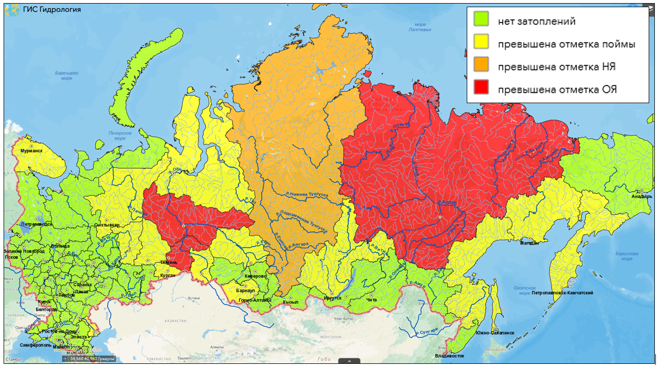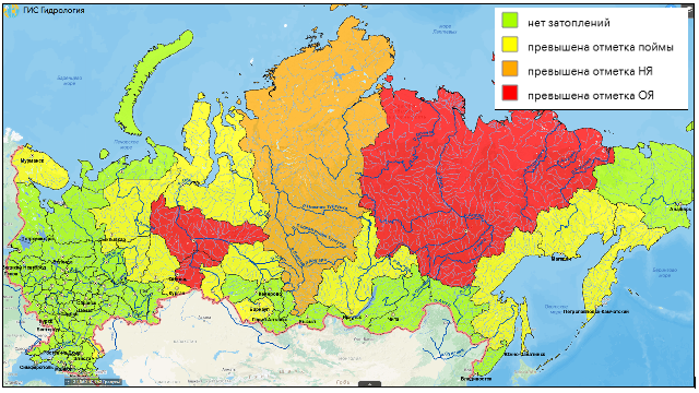 На р. Вандрас у п. Салым (ХМАО), р. Енисей у с. Верещагино (Красноярский край), р. Енисей у г. Кызыл (Тыва), р. Лена у п. Витим (Якутия), р. Большой Анюй у гмс Константиновская, р. Майн у с. Ваеги (Чукотка) наблюдается превышение неблагоприятной отметки уровня воды.