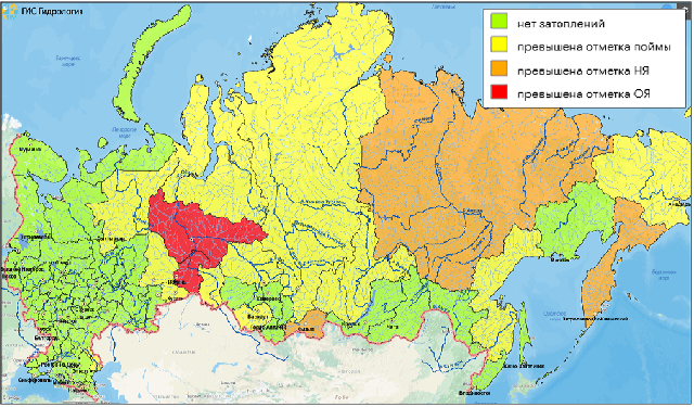 На р. Енисей у г. Кызыл (Республика Тыва), р. Камчатка у с. Верхне-Камчатск (Камчатский край) наблюдается превышение неблагоприятной отметки уровня воды. На р. Лена у п. Витим (Якутия) и р. Оклан у с. Оклан (Камчатский край) уровень воды превысил неблагоприятную отметку.