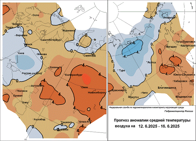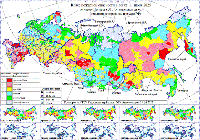 Высокая, местами чрезвычайная пожарная опасность 12 июня на севере Мурманской области, в Белгородской, Свердловской, Челябинской, Курганской областях, 12-14 июня на юге Мурманской, востоке Архангельской областей, в Воронежской области, Южном федеральном округе, Ставропольском крае, на севере Дагестана, в Луганской и Донецкой Народных Республиках, Запорожской, Херсонской, Саратовской, Оренбургской, Омской, Томской, Новосибирской областях, в Ханты-Мансийском а.о., на юге Алтайского края, в центре и на востоке Иркутской области, в Бурятии, Забайкальском крае, Якутии, Магаданской области, на севере Хабаровского и западе Камчатского краев.