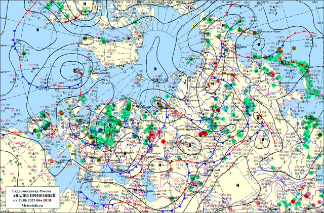 Активный циклон и связанная с ним фронтальная система быстро перемещается с севера Урала в юго-восточном направлении; в начале периода на большей части Уральского региона и севере Сибири, затем в южных районах Сибири прогнозируются дожди, в отдельных районах сильные ливневые дожди с грозами, градом и порывистым ветром до 18-23 м/с.