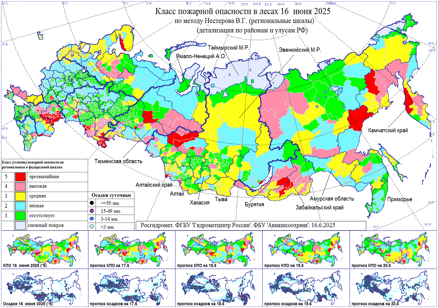 Высокая, местами чрезвычайная пожарная опасность 17 июня в Оренбургской области, Башкортостане, 17-19 июня в Архангельской, Волгоградской, Астраханской, Запорожской, Херсонской областях, Республике Крым, Калмыкии, на востоке Ханты-Мансийского а.о., в Томской, области, на западе Алтайского края, в Бурятии, Забайкальском крае, на западе Якутии, в Магаданской области, Камчатском крае.
