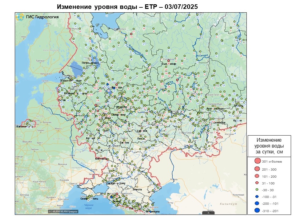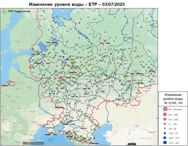 Дождевые паводки с ростом уровня (на 0,4-1,0 м) наблюдаются на водных объектах Южного, запада Северо-Западного, севера Центрального, северо-запада, юго-запада Сибирского, востока и юга Дальневосточного федеральных округов. Наиболее интенсивный рост уровня воды (на 1,6-1,9 м) отмечается на р. Яна у п. Усть-Куйга (Якутия), р. Витим у с. Неляты, р. Ингода у с. Красноярово, р. Нерча у с. Зюльзя, р. Куанда у ГП Куанда (Забайкальский край) (Рисунок 1, 2).