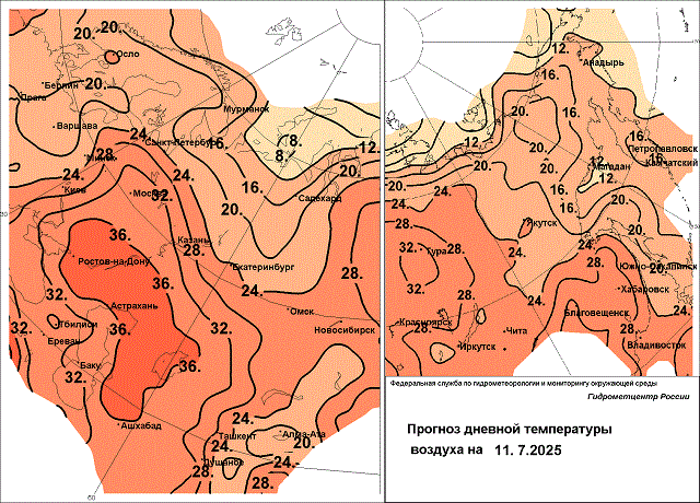 В пятницу, 11 июля на юго-западной периферии антициклона над Белым морем будет преобладать погода без осадков, лишь к вечеру в Московской области пройдет местами пройдет кратковременный дождь с грозой. Погода сохранится аномально жаркой со среднесуточной температурой воздуха выше нормы на 7° и более. Температура воздуха составит ночью в Москве 18…20°, в центре города 23…25°, по области 17…22°, днем в Москве сильная жара, температура 34…36°, по области 31…36°. Возможно в городе будет поставлен новый рекорд максимальной температуры. Пока в 1996 году было 35,6° на метеостанции ВДНХ.