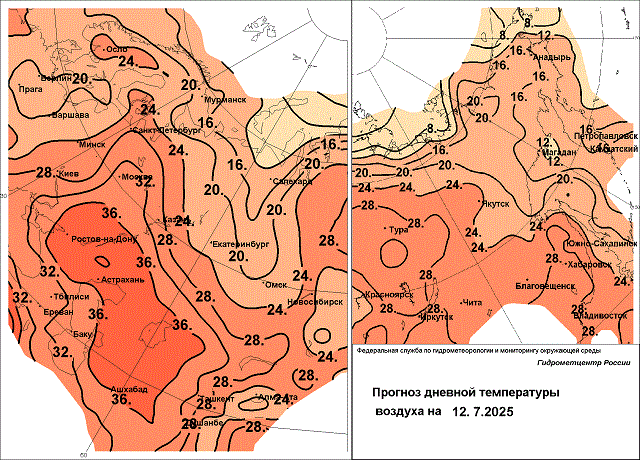 12 июля. Переменная облачность. Ночью без осадков, температура в Москве 20...22° (в центре города 24...26°), по области 17...22°. Днем местами кратковременный дождь, сильная жара, температура в Москве 33...35°, по области 30...35°. Ветер юго-восточный 5-10 м/с. Рекорд для этого дня, 34,5° был в 1903 году.