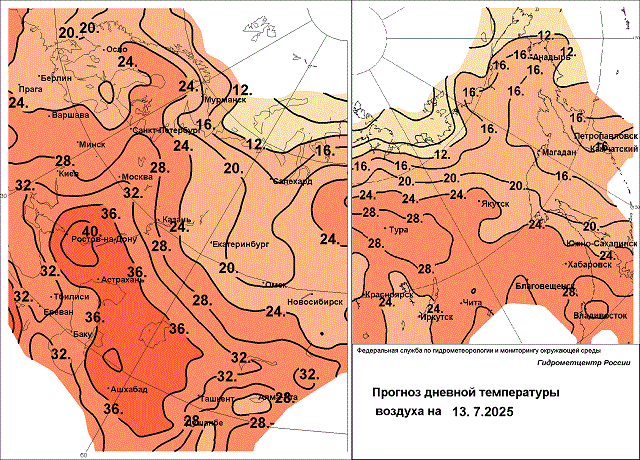 13 июля. Переменная облачность, ночью местами кратковременный дождь, днем кратковременный дождь. В отдельных районах гроза. Температура ночью в Москве 19…21°, в центре города 23…25°, по области 17…22°, днем в Москве сильная жара, температура 30…32°, по области 28…33°. Ветер восточной четверти 5-10 м/с, днем при грозе порывы до 15 м/с.