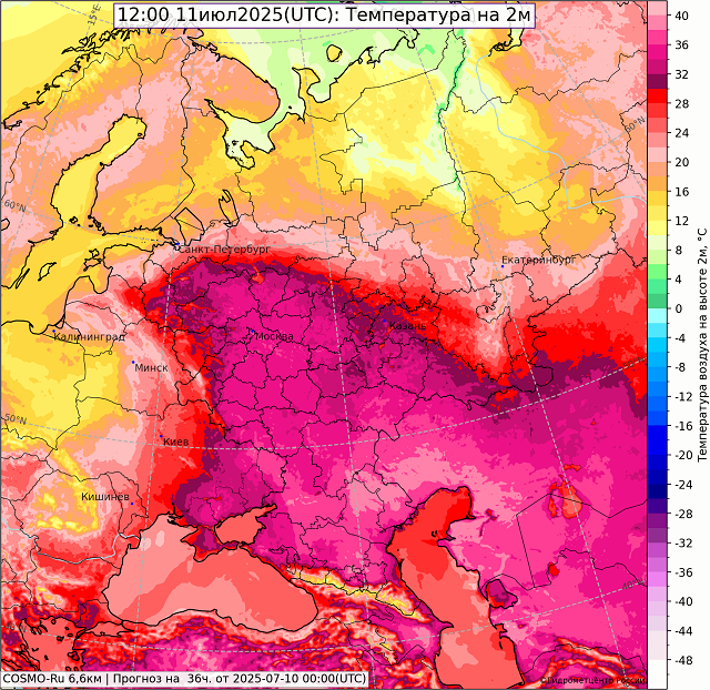 В пятницу, 11 июля в области повышенного атмосферного давления будет преобладать погода без осадков, лишь вечером в Московской области местами возможен кратковременный дождь и гроза. В Москве преимущественно без осадков, сильная жара, температура в Москве 34...36°, по области 31...36°, ветер юго-восточный 6-11 м/с. Есть большая вероятность, что состоится второй температурный рекорд. Пока в 1996 году было 35,6° на метеостанции ВДНХ.