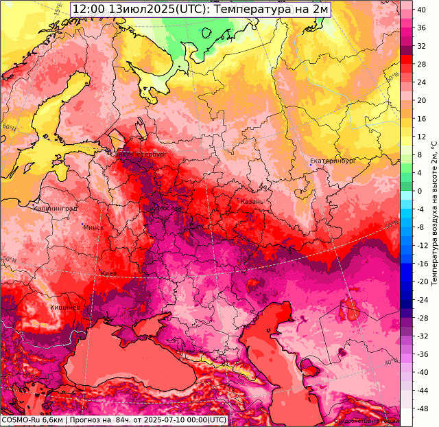 13 июля. Переменная облачность, ночью местами кратковременный дождь, днем кратковременный дождь. В отдельных районах гроза. Температура ночью в Москве 19…21°, в центре города 23…25°, по области 17…22°, днем в Москве сильная жара, температура 30…32°, по области 28…33°. Ветер восточной четверти 5-10 м/с, днем при грозе порывы до 15 м/с.