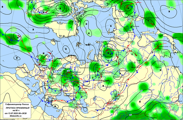В понедельник, 14 июля под влиянием циклона и его атмосферных фронтов, сам циклон который будет располагаться между истоком Дона и Средней Волгой, будет преобладать погода с кратковременными дождями, местами пройдут сильные дожди, в отдельных районах гроза и ветер с порывами 15-17 м/с. В Москве возможно останется сильная жара, температура в черте города днем 28…30°, по области 26...31°. Температурный рекорд для этих суток останется неизменным.