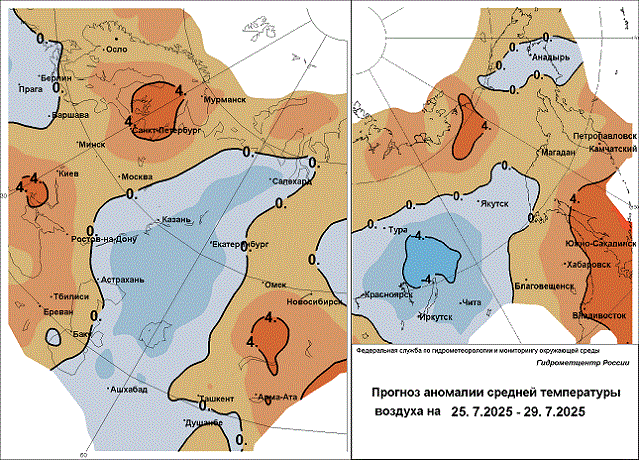 25-27 июля. В северо-восточных районах Кабардино-Балкарии и степных районах Северной Осетии сильная жара (температура днем до 38°). В Якутии сильный дождь, гроза, ветер 15-20 м/с. В Хабаровском, Приморском краях и Амурской области ливневый дождь.