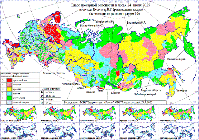 Высокая, местами чрезвычайная пожарная опасность 25-27 июля в Мурманской, Архангельской, Вологодской областях, Карелии, Коми, в Южном федеральном округе, Донецкой и Луганской Народных Республиках, Херсонской и Запорожской областях, Ставропольском крае, Дагестане, Чеченской Республике, Кировской, Самарской, Оренбургской, Челябинской областях, на западе Алтайского, севере Красноярского краев, юге Бурятии, в Якутии, на западе Чукотского а.о.