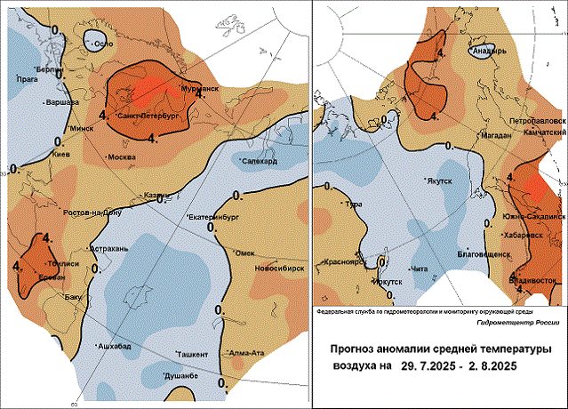 29-30 июля. В Мурманской области сильная жара (температура днем до 33°), 30 июля сильный дождь, гроза. Сильная жара в Адыгее, в Крыму, в Ставропольском крае (температура днем до 40°), на территории МО Сочи и ФТ Сириус, в Тыве (до 38°). В Амурской области сильный и очень сильный дождь, сильный ливневый дождь, гроза, ветер до 20 м/с. В Забайкальском крае сильный дождь, гроза, 29 июля очень сильный дождь, сильный ливневый дождь, град, ветер до 24 м/с.