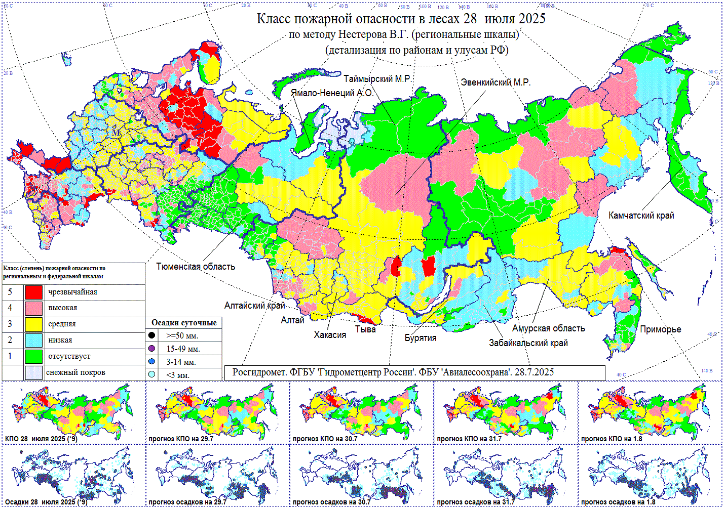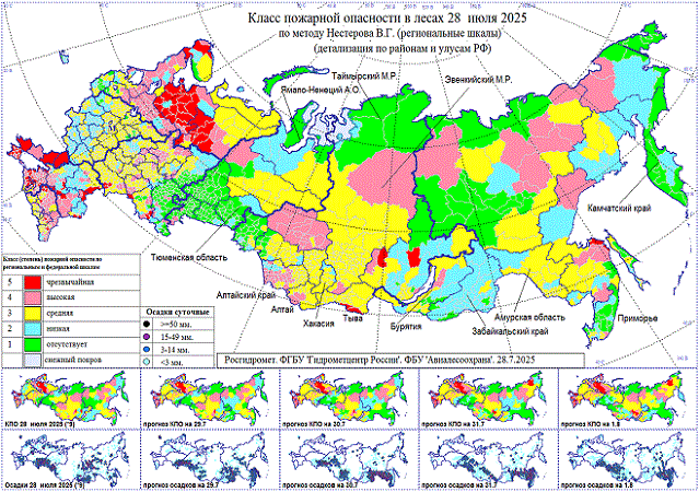 Высокая, местами чрезвычайная пожарная опасность 29-31 июля в Северо-Западном, Южном, Северо-Кавказском, Приволжском федеральных округах, Донецкой и Луганской Народных Республиках, Херсонской и Запорожской областях, Томской области, Алтайском крае, на севере Красноярского края, юге Иркутской области, востоке Якутии, западе Чукотского а.о.